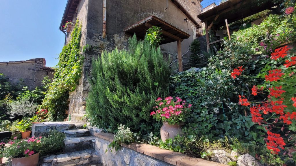 Talomme pihan pinta-ala lienee yhteensä noin 100 m², ja se on neljässä tasossa, ja sitä ympäröi piikikäs karhunvatukka-aita. Italiassa kasvit kasvavat nopeasti, mikä tuottaa jatkuvasti puutarhanhoidollisia haasteita, kun puutarhajätettä lähtee biojätteeseen pussitolkulla. Kaikki suurin piirtein maantasalla olevat hommat, jotka vaativat oksasaksia ja lapiota, onnistuvat suhteellisen jouhevasti, ellei puskasta hyökkää ampiainen, skorpioni, rotta, käärme tai iso heinäsirkka. Sisiliskot on kivoja, niistä ei sen suurempaa lukua.